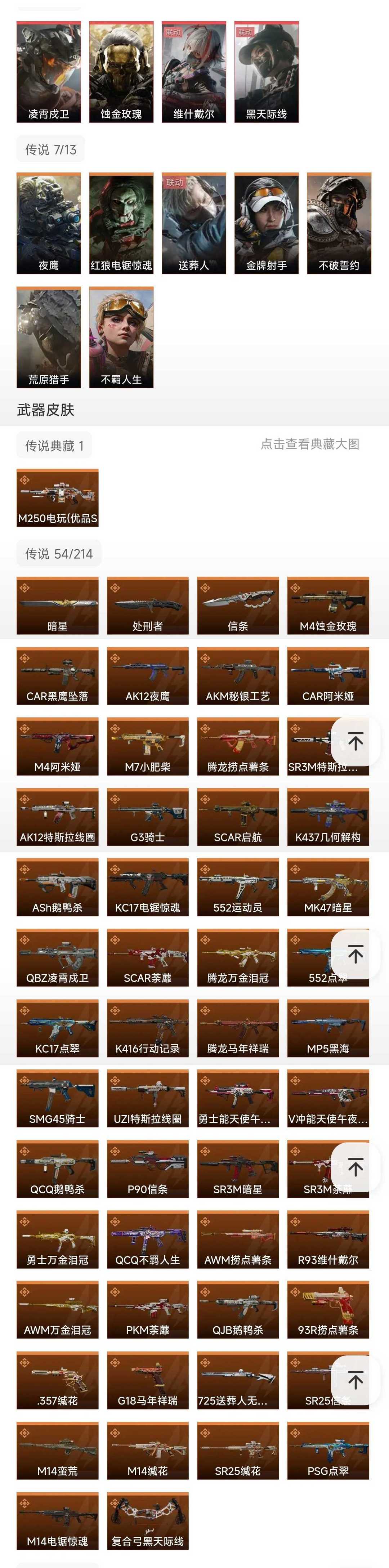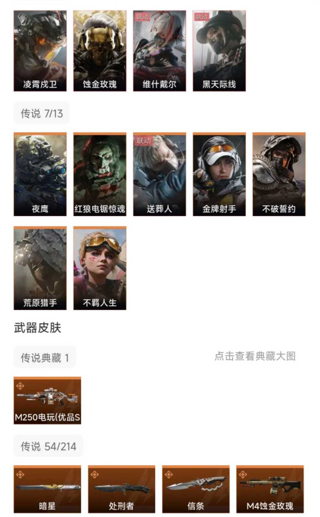 皮肤号 暗星信条凌霄戍卫,13干员蚀金玫瑰 维什戴尔,53款传说枪皮